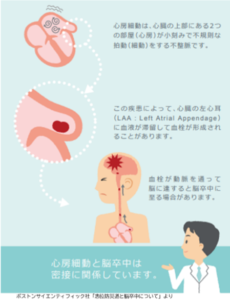 心臓が小刻みに振動する(心房細動)ことにより血栓が生じやすくなり、この血栓が心臓から脳の血管に移動し、時には突然大きな脳血管を閉塞し(心原性脳梗塞)、重度の機能障害や場合によっては死に至ることがある疾患を引き起こします。特に左心房から耳たぶ状に突出する左心耳(LAA:Left Atrial Appendage)は、血液が滞留して血栓が形成されやすい部分で、心房細動が原因の血栓の多くはこの左心耳で発生します。