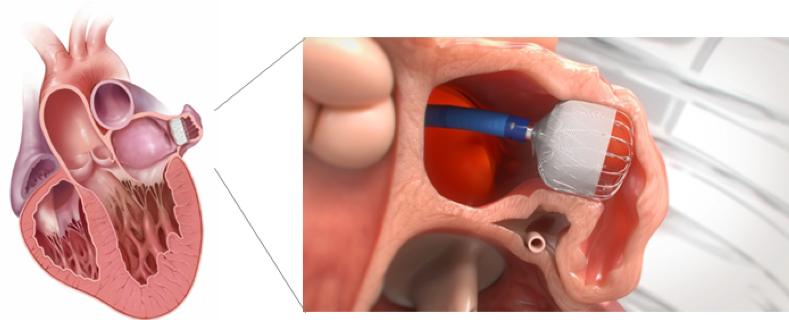 ワルファリンや直接経口抗凝固薬(DOAC)などの抗凝固薬を長期間服用できない心房細動患者さんの脳卒中リスクに対する新しい治療です。