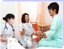 私たちは、担当医師の下、心臓リハビリテーション専従者を含む数名の理学療法士と病棟の看護師がチームとして協力しながら対応しています。患者様と共に早期退院に向けて、 体力向上、日常生活活動の向上を目標に、支援させていただいております。